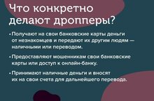 Дропперы, или дропы, — это помощники мошенников. Они занимаются выводом и обналичиванием похищенных денег, могут передавать мошенникам свои банковские карточки, чтобы те использовали счета в преступных схемах. Иногда на карты дропперов жертвы переводят деньги, думая, что это так называемые «безопасные счета». Потом средства проходят через цепочку переводов и обналичиваются.