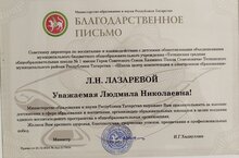 Благодарственным письмом Министерства образования и науки Республики Татарстан за высокие достижения в сфере образования и воспитания, организацию образовательных площадок в целях создания единого воспитательного пространства в общеобразовательных организациях отмечена советник директора по воспитанию и взаимодействию с детскими общественными объединениями МБОУ " Тетюшская СОШ №1 им.Ханжина П.С." Лазарева Людмила Николаевна. Благодарим за работу и желаем новых идей и свершений!