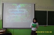 25 нче апрельдә 5БВ сыйныфында (татар төркеме) Хәмидуллина Рузилә Илзар кызы тарафыннан “ Китап турында мәкальләр һәм табышмаклар кичәсе” үткәрелде. Максатлары: укучыларның иҗади фикерләү сәләтләрен активлаштыру, бәйләнешле сөйләм телен үстерү, татар теленең байлыгын, матурлыгын күрсәтү аша аңа ихтирам хисләре тәрбияләү. Укучылар үткәрелгән кичәдән канәгать калдылар. 25.04.2012