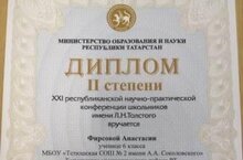 10 ноября 2023 года ученица 6Б класса Фирсова Анастасия успешно защитила исследовательскую работу “Интеллигент из дореволюционных Бюрган”(о первом директоре Тетюшской чувашской учительской семинарии) на XXI республиканской научно-практической конференции школьников имени Л.Н. Толстого в МБОУ «Гимназия №7 им. Героя России А.В. Козина» (секция «Исследования, творческие работы, посвященные «Году педагога и наставника»). Анастасии вручен Диплом II степени Министерства образования и науки Республики Татарстан.