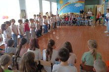 Утром мальчишки и девчонки встретились в спортзале, где под руководством Похлебкина А.В. прошла церемония поднятия Государственных флагов РФ и РТ. После организационных моментов, таких как: придумать название, девиз и речовку в отрядах, изучение инструктажей, ребята отправились в городской парк на праздник, посвящённый Дню защиты детей.