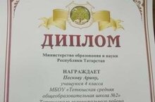 Ученица 4 А класса Пескова Арина заняла 2 место в конкурсе и награждена дипломом МО и Н РТ. Поздравляем!!!!! -