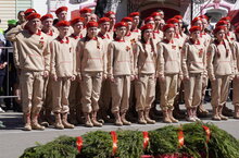 Чеканя шаг, по площади прошествовали в том числе и учащиеся школы - отряд юнармейцев (8-9 классы).