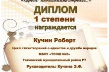 За участие в Региональном конкурсе авторских произведений «Пером написанные строки…», дипломом I степени награждён ученик 6Б класса МБОУ «Тетюшская средняя общеобразовательная школа №2» Кучин Роберт, руководитель: Кучина Эльмира Фаннуровна, учитель родного русского языка и литературы.