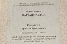 Поздравляем ученика 11 класса Семёнычева Ярослава - призера региональнного этапа Всероссийской олимпиады школьников по географии и наставника - учителя географии Хатыпову Дилбяр Гильмановну. Желаем новых достижений и побед!