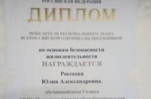 Поздравляем победителя регионального этапа всероссийской олимпиады школьников по основам безопасности жизнедеятельности Россееву Юлию, ученицу 9 класса и руководителя, учителя ОБЖ Похлёбкина Алексея Владимировича !