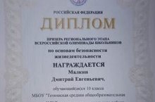 Поздравляем призера регионального этапа всероссийской олимпиады школьников по основам безопасности жизнедеятельности Малкина Дмитрия, ученика 10 класса и руководителя, учителя ОБЖ Похлёбкина Алексея Владимировича !