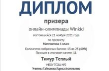 Поздравляем ученика 6А класса Теплого Тимура – призера онлайн-олимпиады Winkid по математике, организованной Министерством образования и науки РТ, Казанским (Поволжским) федеральным университетом. (Учитель Тайманова Лариса Анатольевна)