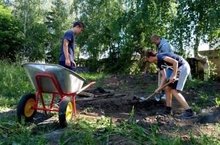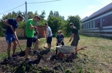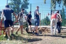 Сегодня трудовая бригада занимается благоустройством стадиона.