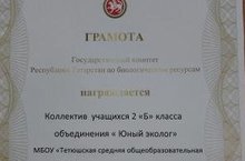 Учащиеся 2Б класса объединения «Юный эколог» (руководитель Михеева И. Ю.) награждены грамотой ГПКЗ «Долгая Поляна» за активное участие в природоохранной акции, посвящённой Международному Дню птиц (изготовление скворечников). Молодцы!!!
