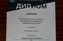 Михеева Ирина Юрьевна, учитель начальных классов - лауреат конкурса методических разработок «Современный урок», объявленный ГАОУ ДПО «Институт развития образования Республики Татарстан», целью которого является: • повышение профессионального мастерства педагогов; • выявление и распространение передового педагогического опыта; • обобщение и распространение инновационного опыта работы педагогов, связанного: – с применением современных образовательных технологий (в том числе информационно-коммуникационных); – с применением системно-деятельностного подхода, активных форм обучения, современных средств оценивания учебных достижений учащихся; – с повышением качества образования в процессе реализации федеральных государственных образовательных стандартов; • совершенствование научно-методического обеспечения образовательного процесса; • поддержка творческих педагогов и подъема престижа учительской профессии.