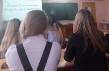 В этом году жители РТ отметили знаменательную дату - 25-летие со дня принятия Конституции РТ. В честь этого события 7 ноября в 10 классе (классный руководитель Шакирова С.М.) был проведён классный час педагогом-организатором МБУ "Подвиг" Обидиной Ксенией Валерьевной. Она провела викторину, целью которой было ознакомить учащихся с Конституцией РТ. Класс был поделён на две команды, и каждая команда отвечала на поставленные вопросы. Несмотря на сложность вопросов, ученики справились с задачей, узнали для себя много нового. Они остались довольны, поблагодарили педагога-организатора и изъявили желание, чтобы такие встречи проводились чаще.
