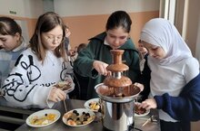На столе традиционный торт со свечами заменил шоколадный фонтан, фрукты и напитки.
