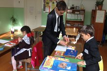 Сегодня в нашей библиотеке прошло посвящение в читатели первоклассников. Двум самым озорным мальчишкам школы библиотекарь провела экскурсию по библиотеке. Ребята познакомились с правилами пользования книгой и основными правилами поведения в библиотеке. Ребята записались в библиотеку и уже заинтересовались художественной литературой.