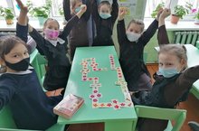 Учащиеся начальных классов с удовольствием на перемене играют в Веселое домино (Күңелле домино), с элементами татарского народного орнамента.
