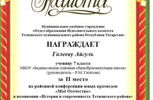 Ученица 7 класса Галеева Айгуль (руководитель – Р.М. Гизятова) сегодня участвовала в районной конференции юных краеведов "Мое отечество" и заняла второе место. Поздравляем!