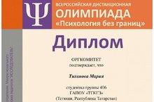 Студентка 406 группы специальности "Физическая культура" Мария Тиханова стала призером республиканского этапа всероссийской олимпиады "Психология без границ - 2020"!