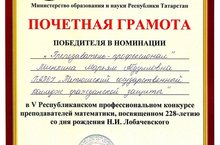 - Победитель конкурса на присуждение премий лучшим учителям РТ, 2019 г;