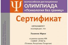 Студентка 406 группы Мария Тиханова прошла первый тур Всероссийской олимпиады "Психология без границ", преподаватель психологии - В.П.Ватутина