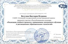 Заместитель директора по научно-методической работе Ватутина В.П. приняла участие в Республиканском семинаре «Реализация учебного процесса с применением электронного обучения и дистанционных образовательных технологий», где поделилась опытом организации и методического сопровождения дистанционного обучения. Статья "Будни дистанта: плюсы и минусы. Из опыта организации и методического сопровождения дистанционного обучения в ГАПОУ "Тетюшский государственный колледж гражданской защиты" опубликована в сборнике материалов семинара.