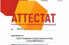 Тетюшский государственный колледж гражданской защиты является специализированным центром компетенций (СЦК), аккредитованным по стандартам WorldSkills, с присвоением Национального статуса по компетенции «Спасательные работы». Аттестат Союза «Молодые профессионалы (Ворлдскиллс Россия)» № 103-19/2202 от 26.07.2019.