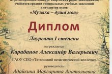 Студенты выпускной группы отделения «Музыкальное образование» ГАОУ СПО «Тетюшский педагогический колледж» Карабанов Александр и Дубов Дмитрий приняли участие в III региональном конкурсе творческих работ школьников, учащихся ССУЗ и студентов ВУЗов «Музыка-душа моя». Конкурс проходил на базе ФГБОУ ВПО «Чувашский государственный университет им. И.Я.Яковлева». Жюри высоко оценило творческие работы одаренных студентов в номинации «ЭССЕ»: Карабанов А.-Диплом 1 степени (руководитель Адайкина Маргарита Анатольевна), Дубов Д.-Диплом 3 степени (руководитель Старостина Алена Геннадьевна). Коллектив колледжа гордится своими студентами и их наставниками, желает дальнейших побед!