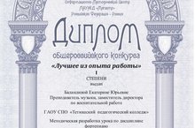 Дипломом I степени Второго Общероссийского проекта «Лучшее из опыта работы» конкурса методических разработок уроков и внеклассных мероприятий для педагогов удостоена заместитель директора по воспитательной работе, преподаватель музыки Баландина Е.Ю. за методическую разработку урока по дисциплине фортепиано для студентов 4-х курсов специальности 050601 «Музыкальное образование» «Формирование музыкально - исполнительских навыков в классе фортепиано как необходимое условие профессиональной подготовки будущего учителя музыки».Сертификатом участника Второго Общероссийского проекта «Лучшее из опыта работы» конкурса методических разработок уроков и внеклассных мероприятий для педагогов удостоена заместитель директора по воспитательной работе, преподаватель музыки Баландина Е.Ю. за разработку учебно – методического пособия контрольно – измерительных материалов по дисциплине «История музыки и музыкальная литература» Раздел «Отечественная музыка XX века» специальность 050130 «Музыкальное образование» /базовая подготовка/.