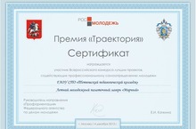 ГАОУ СПО «Тетюшский педагогический колледж» награжден СЕРТИФИКАТОМ Премии «ТРАЕКТОРИЯ» Всероссийского конкурса лучших проектов, содействующих профессиональному самоопределению молодежи.Программа колледжа «Летний молодежный палаточный лагерь «Мирный» признана Федеральным агентством по делам молодежи однимиз лучших представленных проектов. Авторы проекта - Адаева Т.Ю., Евграфова В.А.