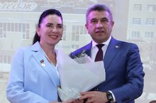 На фото: Министр образования и науки Республики Татарстан И.Г. Хадиуллин вручает знак отличия "Почётный наставник" Т.Ю. Адаевой. -