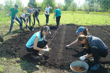 На пришкольном участке ведутся весенние работы. Учащиеся под руководством заведующего пришкольным участком сеют, сажают овощи.