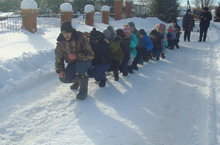 - "Эшелон" - участники встают в колоннуи принимают положение приседа положив руки на плечи впереди стоящему.