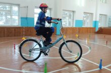 Члены отряда ЮИД готовятся к муниципальному этапу конкурсу юных инспекторов движения "Безопасное колесо". Для учащихся начальных классов показывают технику вождения на велосипеде.