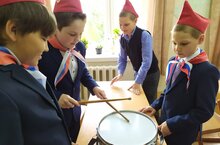 Ребята на переменах учатся трубить в пионерский горн. Пока не у всех получается, но они очень стараются.