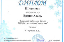 Поздравляем воспитанника подготовительной группы Вафина Аделя с Дипломом III степени в региональном конкурсе - выставке декоративно прикладного творчества "Поздравление Деду Морозу" г Наб.Челны "Центр детского творчества №16 "ОГНИВО"