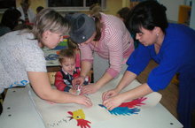 Родители и дети средней группы №11 «Пчёлки» выполнили коллективную работу по художественно-эстетическому развитию с использованием нетрадиционной техники «Ладошки» по теме «Петушок – золотой гребешок»