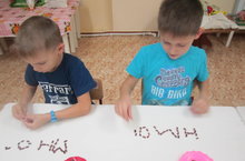 Упражнения с крупами развивают у ребенка не только мелкую моторику, но тактильные ощущения. Выкладывание букв из различных материалов – серьезное занятие. Оно требует от детей усидчивости и терпения, развивает навык выполнять действие по заданному образцу. -