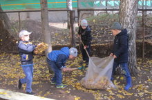 Дети принимают участие в уборке участка от опавшей листвы. Коллективный труд в природе дает возможность формировать трудовые навыки и умения одновременно у всех детей группы