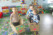 Толчком для возникновения ролевой игры детям могут послужить какие-нибудь атрибуты. В качестве игровых атрибутов для игры в группе и на улице, можно использовать большие разрисованные коробки. По желанию детей (и по предложению воспитателя) они могут превращаться в паровозики с вагончиками, в машины и автобусы. Для этого малыш просто должен влезть внутрь. А если закрыть коробки, их можно использовать как блоки для строительства. Коробки, конечно, непрочный материал. Но зато их легко обновлять.
