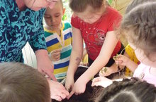 Балалар тәрбияче Люба апалары белән бергәләп помидор үстерү, утырту серләренә өйрәнәләр. 31.03.2015