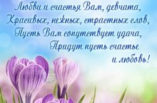 С праздником весны, очарования, красоты и женственности! Пусть каждый день будет таким, как этот: наполнен улыбками, восхищением, любовью, заботой и радостью. Будьте счастливы, ощущая себя женщинами, принцессами, королевами. С 8 Марта, милые дамы!