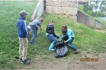 Пока девочки пропалыают грядки, мальчики обновляют школьную географическую площадку.