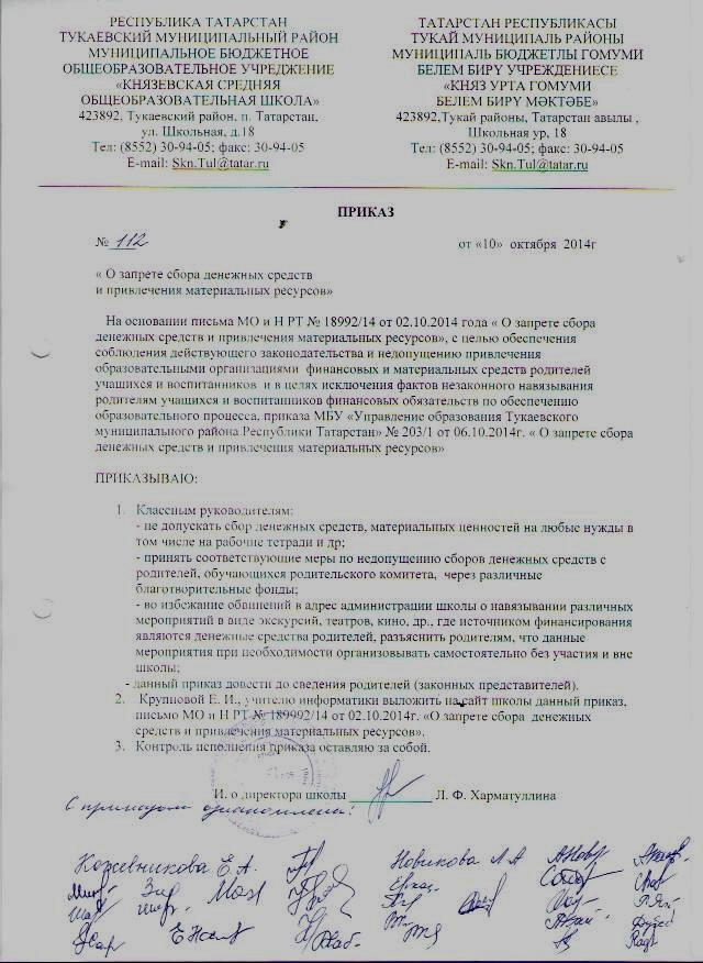 Приказ о запрете сбора денежных средств и привлечения материальных ресурсов от 10.10.2014 г.