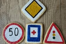 Испекла вместе с бабушкой очень вкусные печенья с изображением дорожных знаков: «Главная дорога», «Ограничение максимальной скорости», «Пункт первой медицинской помощи», «Светофорное регулирование», «Въезд запрещен»Знак «Главная дорога»: