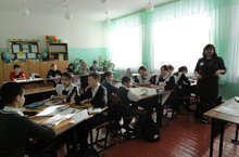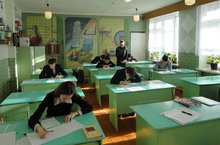 Борды мәктәбенең рус теле укытучысы Елена Петровна 9 класс укучыларыннан рус теле предметы буенча сынап карау имтиханы ала.