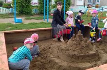 Воспитанники младшей группы построили замок из песка. Они сделали небольшой городок, который был окружен забором. Внутри было две башни и дороги, которые между собой пересекались. Забор дети мастерили сами: брали песок и зажимали ладошками, образуя тем самым ряд. Между башнямипоставили палочку тем самым сделали мостик, под которым проезжали машины. Получилось очень красиво! Дети остались довольны!