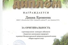 Обучающиеся нашей школы приняли участие в региональном конкурсе аншлагов "Защитим заповедную природу" в рамках международной природоохранной акции "Марш парков - 2015". Ученица 2 класса Еремеева Диана награждена Дипломом за оригинальность.