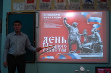 31 октября в школе прошло общешкольное мероприятие приуроченное Дню народного единства, целью которого является формирование представления о новом российском празднике, его истоках и значении, воспитание у школьников гражданских качеств, формирование базисных знаний о символах российского государства и его истории. Мероприятие провел учитель истории и обществознания Васильев Юрий Павлович.