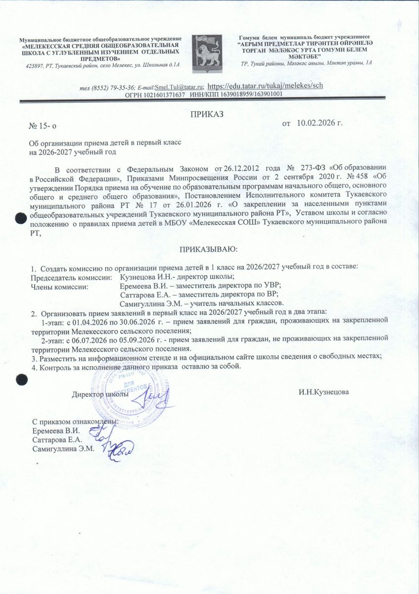 Приказ о создании комиссии об организации приема детей в 1 класс на 2026-2027 учебный год