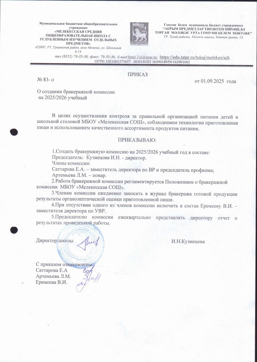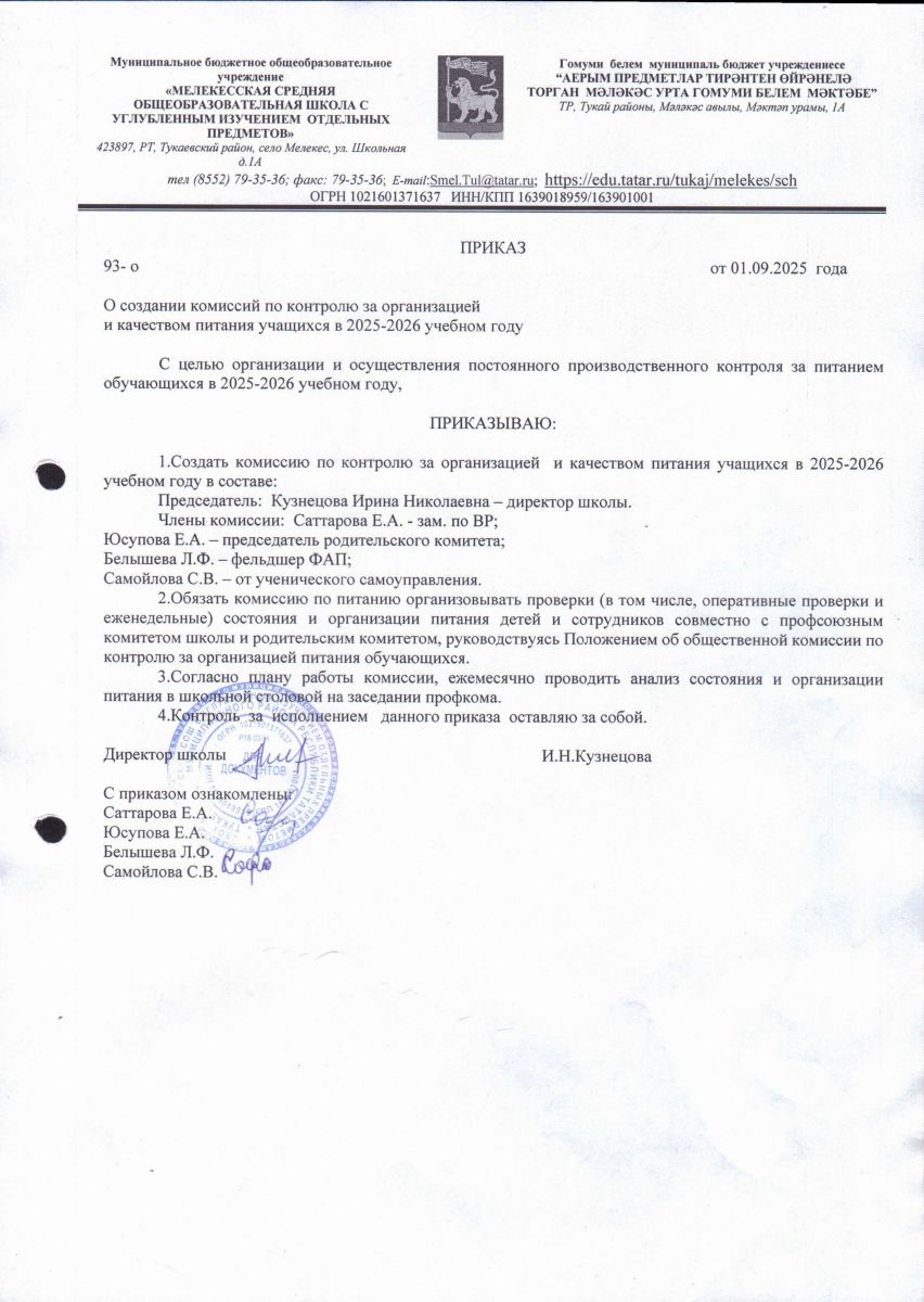 Приказ о создании комиссии по контролю качества питания на 2025\2026