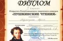 Поздравляем Муртазину Аделю обладателя диплома II степени Открытого Республиканского творческого конкурса "Пушкинские чтения" (руководитель Шарафиева Э.А.).